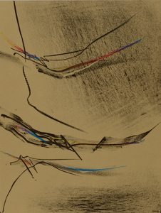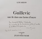 Guillevic, une île dans une larme d’encre. [Neuilly-sur-Seine], Al Manar, début du mois de juin 2007. Plaquette grand in-4 (325 x 255 mm) de [5] ff. le premier et le dernier blancs, les trois autres montés en triptyque, en feuilles, couverture à rabats peinte par Baltazar. Édition originale publiée. Commémoration du centenaire de la naissance d’Eugène Guillevic à Carnac. Texte espagnol sur une page, traduction sur une autre, grande lithographie originale de Julius Baltazar entre les deux ; celle-ci, tirée sur papier Atsukushi du Japon appliqué, est rehaussée de couleurs au crayon arlequin par Baltazar. — Tirage à 49 exemplaires sur papier vélin d’Arches signés par l’auteur et par l’artiste. Inscription autographe au crayon de l’auteur sur le titre : « Pour Gérard et Martine Vidalenche la rencontre de la lumière de Julius, l’amitié de Guillevic et le poème de Luis Mizón. Paris, le 7 novembre 2007 ».