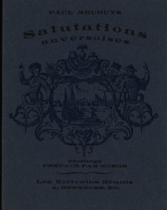 Ensemble trois ouvrages. Le Canari et la cerise. Anvers, Ça ira !, 1921. In-12 carré, broché. Édition originale. Un des 275 exemplaires numérotés sur pur fil. Le Zèbre handicapé. Anvers, Ça ira !, 1923. In-12 carré, broché. Édition originale, ornée d'un portrait d'après Floris Jespers. Un des 50 exemplaires numérotés sur pur fil Lafuma. Envoi autographe signé de l'auteur à Robert Boudry. Salutations anversoises. Lyon, Henneuse, 1954. In-18, broché. Édition originale de ce florilège, préfacée par Norge. Un des 30 exemplaires numérotés sur vélin Johannot, seul grand papier.