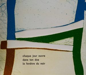 Au bord des Lèvres. Nice, Jacques Matarasso, premier semestre de 1986. Plaquette in-16 oblong (105 x 120 mm) de [12] ff. montés en accordéon avec versos blancs, couverture comprise qui tient lieu de titre, étui. Édition originale. Une partie du texte est imprimée dans les espaces laissés libres par trois gravures originales sur cuivre en couleurs et en relief de Bertrand Dorny – dont deux à pleine page et une à double page. Tirage à 66 exemplaires sur papier vélin d’Arches, celui-ci signé par l’auteur et par l’artiste. Dédicace autographe au crayon face au titre : « Pour Gérard et Martine [Vidalenche] avec mon amitié Bertrand [Dorny] 5 juin [19]86 ». J.-P. Arnaud. Bertrand Dorny, Catalogue raisonné de l’œuvre gravé. 1962-1991. Paris, 2002, n° 535 bis.