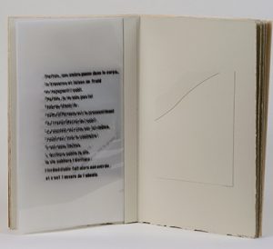 Un pas vers l’oubli. Paris et Mauregny[-en-Haye] (Aisne), l’auteur et l’artiste, 2007. Plaquette très grand in-8 (280 x 175 mm) de [12] ff. montés en accordéon le premier et les versos blancs, couverture, large rabat replié au plat inférieur, enveloppe contenant un CD fixée sur le rempli, étui. Édition originale de ce « livre-collage » produit par l’auteur et par l’artiste et tiré à 9 exemplaires sur papier vélin fort grisâtre signés par Bernard Noël et par Dorny. Elle est ornée de 10 collages originaux de Bertrand Dorny dont plusieurs sont faits de papiers de même nature et de même ton que le support pour suggérer peut-être l’oubli, la perte de la mémoire. Il y a en outre des feuillets intercalaires étroits et d’autres en rhodoïd et en papier calque sur lesquels sont imprimées en duplicata des pages du texte. Un CD contient le texte lu par l’auteur.