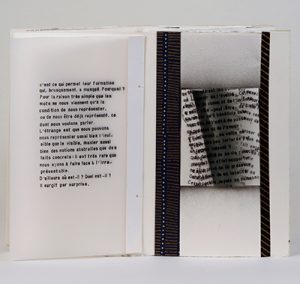 Un pas vers le rêve. Paris et Mauregny[-en-Haye] (Aisne), l’auteur et l’artiste, 2009. Plaquette très grand in-8 (285 x 175 mm) de [12] ff. montés en accordéon le premier, le dernier et les versos blancs, couverture, CD fixé, étui. Édition originale produite en collaboration par l’auteur et par l’artiste, tirée à 9 exemplaires sur papier vélin de Rives signés par Bernard Noël et par Dorny. Elle est ornée de 5 collages originaux à pleine page de Bertrand Dorny. Il y a en outre des bandes intercalaires étroites cousues avec des collages variés ; deux pages du texte sont en version supplémentaire imprimée sur papier calque. — Un CD contient le texte dit par l’auteur. — Joint du même : Un pas vers l'abîme. Paris et Mauregny[-en-Haye] (Aisne), l’auteur et l’artiste, 2009. Plaquette très grand in-8 (285 x 180 mm) de [12] ff. montés en accordéon le premier, le dernier et les versos blancs, couverture, large rabat replié au plat inférieur, étui. — Édition originale tirée à 9 exemplaires sur papier vélin de Rives signés par Bernard Noël et par Dorny. Elle est ornée de 4 collages originaux de Bertrand Dorny.