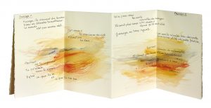 Nuages, 1-2. Laubiès. [Paris (?)], sans nom, décembre 2002. Plaquette in-8 (250 x 165 mm) de 2 ff. blancs, une feuille in-plano avec verso blanc pliée trois fois et formant 8 ff., 2 ff. blancs, couverture à larges rabats peinte en bleu de motifs « tourbillon ». Édition originale manuscrite, calligraphiée à la main par l’auteur (6 pages titre et justification compris), ornée de deux aquarelles originales à double page de René Laubiès. — Réalisation à dix exemplaires sur papier vélin d’Arches signés par l'auteur et par l'artiste.