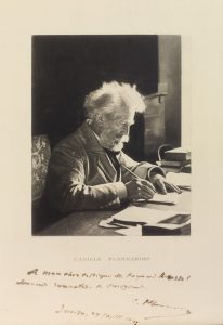 Portrait photographique de Camille Flammarion dédicacé à Raymond Roussel. Juvisy, 1922. Portrait photographique en héliogravure (34 x 26 cm), cadre en bois doré ouvragé. Précieux portrait offert par Camille Flammarion à Raymond Roussel, avec cet envoi autographe signé dans la marge inférieure : A mon cher collègue M. Raymond Roussel, souvenir sympathique de l’original, daté 29 juillet 1922. La photographie a été encadrée par Raymond Roussel et provient de sa collection.