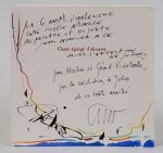 Chant égorgé d’alouette. Nice, J. Matarasso, fin de l’année 2007. Plaquette in-12 carré (160 x 160 mm) de 2 ff. blancs, [16] ff. (soit quatre fois quatre feuillets montés en accordéon à verso blanc), 2 ff. blancs, en feuilles, couverture à larges rabats, peinte. Édition originale de ce poème. Elle est ornée par Julius Baltazar de 3 lithographies originales en couleurs et hors texte tirées sur papier de chine appliqué avec rehauts d’aquarelle et de crayon arlequin (la justification en annonce quatre). — Tirage à 45 exemplaires sur papier vélin d’Arches signés par le poète et par le peintre. Dédicaces autographes sur le faux-titre soulignées de touches d’aquarelle de Baltazar : « Pour G. and M. Vidalenche cette vieille alliance du peintre et du poète pour s’associer à ce Chant égorgé d'alouette avec l’affection de Julius » ; « Pour Gérard et Martine Vidalenche, par la médiation de Julius et en toute amitié S. Stétié ». Exposition Salah Stétié et les peintres, Sète, Musée Paul Valéry, 2013.