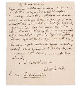 BARTÓK BÉLA (1881-1945) - L.A.S., [Budapest 7 novembre 1912], à l'ethnographe Sándor SOLYMOSSY à Budapest ; 1 page in-8, adresse (carte-lettre) ; en hongrois.