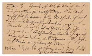 BRAHMS JOHANNES (1833-1897) - L.A.S. «J. Br.», [Wien 23 octobre 1886], à son éditeur Fritz SIMROCK à Berlin ; 1 page oblong in-12, adresse au verso (Correspondenz-Karte) ; en allemand.