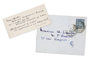 DEBUSSY CLAUDE (1862-1918) - Carte autographe, 2 juillet 1899, à Charles LEVADÉ, «de l'Institut» ; carte de visite à l'adresse 58, rue Cardinet, enveloppe timbrée.