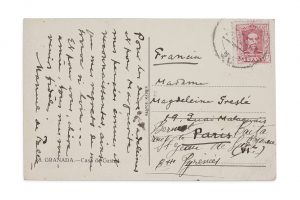 FALLA MANUEL DE (1876-1946) - L.A.S. sur carte postale, [Granada 23.I.1929?], à la cantatrice Magdeleine GRESLÉ ; carte postale illustrée (Granada. Casa de Castril), texte et adresse au dos avec timbre.