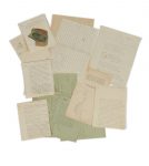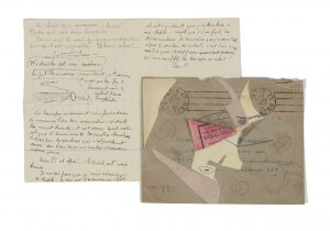 Documents divers comme le bulletin de remise des prix décernés à André Breton en 1901, 126 lettres ou cartes autographes signées d'André Breton ainsi que 6 autres non signées, 7 poèmes autographes signés, 6 dessins originaux, 4 collages, copies manuscrites de poèmes d'Aragon de Valéry et de Cendrars.
