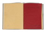 Le feuillet rouge également, à l'encre bleue ou noire sur 19 feuillets de papier vélin ocre dont l'un porte au crayon: «page blanche».
