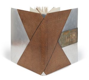 Dos lisse, triple empiècement en peau d'autruche ocre et noire couvrant le dos et les deux tiers des plats, titre gravé sur le premier plat sur une plaque métallique que l'on retrouve sur le second plat.