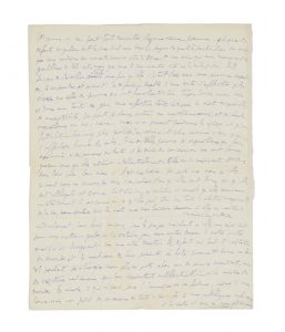 ♦ Manuscrit à l'encre violette comportant en tête du texte un passage inédit, séparé d'un trait de plume du portrait de Madame de Réveillon, qui n'est pas sans évoquer la chambre de Combray de laquelle le narrateur de «À la Recherche du temps perdu» entendra les discussions dans le jardin :