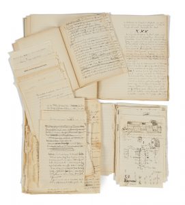 • un état intermédiaire de 8 pages in-4 et in-8 dactylographiées avec de nombreuses corrections et ajouts autographes.