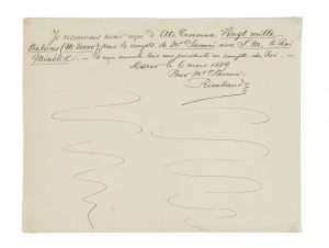 Reçu autographe à l'encre d'une écriture appliquée daté, signé et illustré par Arthur Rimbaud de lignes à l'encre remplissant la page en dessous du texte autographe.