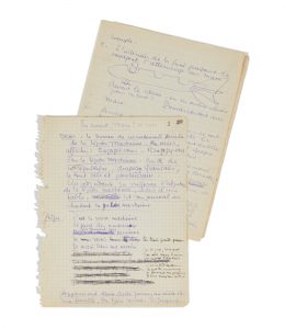 9 pages de notes et de plans relatifs à «En avant Mars!» à l'encre avec un dessin original de Boris Vian représentant l'intérieur de la fusée pendant le voyage.