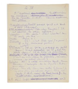 Projet de sketch manuscrit autographe à l'encre violette avec ratures et corrections.