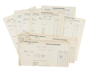 Ensemble de 12 fiches de paiement émises par la Compagnie générale aéropostale, dont deux par sa filiale sud-américaine, en faveur de Jean Mermoz, lors d’essais d’hydravions et de la traversée de l’Atlantique sud sur le Comte de la Vaulx. Complétées de manière plus ou moins précises, elles peuvent indiquer : le décompte du fixe, le décompte des étapes, les majorations pour vols de nuit, les primes (pour « Essais avions nouveaux ») et les indemnités (pourcentage par passager), le détail des vols effectués (date, numéro, heures de départ et d’arrivée, durée, nombre d’étapes, noms de l’équipage et des passagers), etc.
