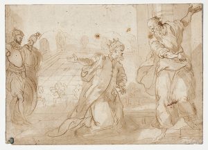 MAGANZA GIOVANNI BATTISTA (VERS 1513 - 1586), ATTRIBUÉ À - Scène biblique Plume et encre brune, lavis brun Porte une inscription en bas à droite Lanfrasio Porte en bas à gauche des traces de cachet de collection 14,6 x 20,5 cm