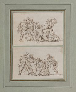 ECOLE ITALIENNE DE LA FIN DU XVIIIe SIÈCLE - Deux femmes attaquées par des guerriers Deux dessins sur le même montage, plume et encre brune Au verso, Un cavalier enlevant une femme et Un couple 17 x 27,1 cm