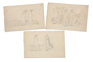 ÉCOLE FRANÇAISE DU XIXe, SUIVEUR DE JOHN FLAXMAN. ILLUSTRATIONS MYTHOLOGIQUES Trois dessins, plume et encre noire sur traits de crayon noir 15 x 23,5 cm les trois