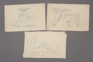 ÉCOLE FRANÇAISE DU XIXe, SUIVEUR DE JOHN FLAXMAN. ILLUSTRATIONS MYTHOLOGIQUES Trois dessins, plume et encre noire sur traits de crayon noir 15 x 23,5 cm les trois.