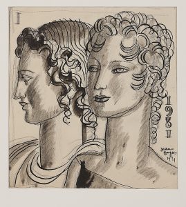 DUPAS JEAN (1882 - 1964). Profils de femmes. Dessin au fusain et à l'encre de Chine. Signé en bas à droite et daté 1931. 17,5 x 16,5 cm.