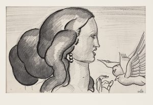 DUPAS JEAN (1882 - 1964). Profil aux colombes, Dessin au fusain et encre de Chine Monogrammé en bas à droite. 11 x 17 cm.
