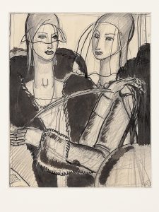 DUPAS JEAN (1882 - 1964) - Couple aux voilettes Dessin à l'encre de Chine et fusain monogrammé en bas à droite. 16,5 x 13,5 cm.