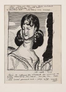 DUPAS JEAN (1882 - 1964) - Femme au chignon Dessin à l'encre de Chine et fusain monogrammé et daté 18 Nov.1926 et annotations de l'artiste. 16,5 x 13,5 cm.