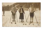 • une photographie originale tirée sur carte postale représentant Max ERNST, GALA et Paul ELUARD chaussés de skis à la montagne.