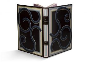 Box noir orné sur les deux plats d'un encadrement de cinq listels mosaïqués bord à bord en box or, vert amande, rose, bleu pâle et argent, et de deux grandes volutes constituées de quatre listels mosaïqués en léger relief, en box gris, vert émeraude, parme et bleu pétrole, dos lisse portant le titre avec rappel du décor, doublures et gardes de daim parme, tranches dorées sur témoins, exemplaire monté sur onglets, couverture et dos conservés, chemise titrée et étui bordé de même peau (P.-L. Martin, 1981).