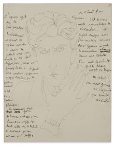 Autoportrait de Jean COCTEAU (Le Mystère de Jean l'Oiseleur), dessin original à l'encre de Chine comportant dans les marges ce texte autographe :