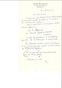 Lettre autographe sur son papier entête «René Magritte 97 rue des Mimosas, Bruxelles» adressée à l'éditeur belge André DE RACHE.