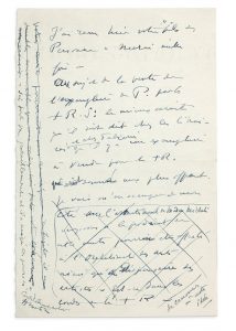 «le mieux serait qu'il soit dit chez les libraires et chez Fabiani qu'il y a un exemplaire à vendre pour la + R, qui serait donné au plus offrant». Il se demande «si le produit de cette vente pourrait être offert à l'Orphelinat des Arts ainsi qu'au Dispensaire des artistes. Est-ce dans les cordes de la + R.»; mais il raye les 9 lignes sur ce sujet, indiquant en marge: «Je renonce à cette idée». Il ajoute pour finir: «Ici tout va pareillement et il a neigé ces jours-ci»...