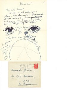 ► Lettre autographe signée de PICABIA à l'artiste Méraud GUEVARA illustrée d'un dessin original représentant deux yeux grands ouverts et un personnage escaladant une sphère légendée :
