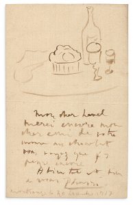 ► Lettre autographe signée de Pablo PICASSO à André LEVEL illustrée d'un dessin original à l'encre représentant sur une table une bouteille, des verres, et une cassolette, illustrant la lettre :
