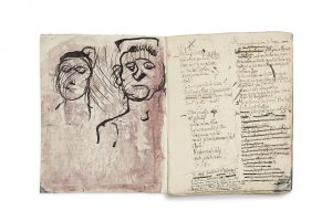 Ce carnet présente d'importantes ratures et corrections, avec de nombreux vers biffés. Il présente au verso du premier feuillet deux DESSINS à l'encre de Chine :