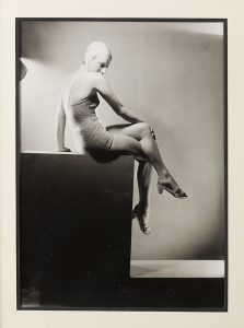 Tirage argentique d'époque de Laure Albin-Guillot représentant une femme en maillot de bain sur un podium. Tampon de Roger Viollet au verso, qui a racheté en 1964 le fonds de l'atelier de Laure Albin-Guillot.