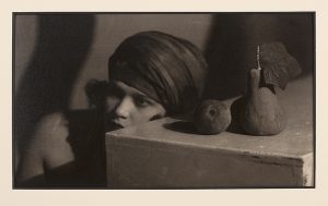 Tirage argentique d'époque représentant une jeune femme au turban à moitié cachée derrière un meuble sur lequel sont posés des fruits.