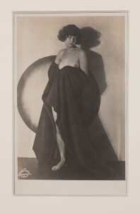 Tirage argentique d'époque inséré sur carton représentant une femme demi-nue devant un cercle.