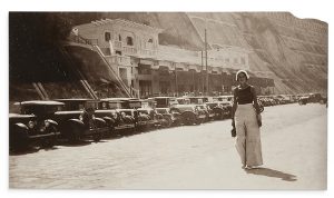 Tirage argentique d'époque représentant Renée PERLE devant une enfilade de voitures, à la côte des Basques à Biarritz en août 1930.