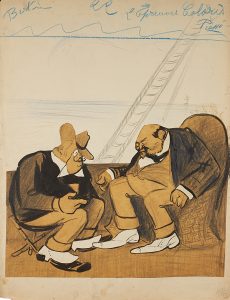 Camara, Léal de - Roosevelt et Edouard Vii. Dessin au lavis sur papier calque, découpé et contrecollé sur papier fort, représentant un entretien entre les deux dirigeants. Non signé, 63 x 48 cm.