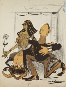 Camara, Léal de - L’Entente italo-égyptienne. Dessin au lavis et rehauts de gouache sur calque, découpé et contrecollé sur papier fort, représentant l’idylle entre l’Italie et l’ancien pays des pharaons. Signé en bas et à droite, 62 x...
