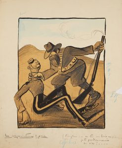 Camara, Léal de - La guerre des Boers. Dessin au lavis sur papier calque, découpé et contrecollé sur papier fort, représentant une scène de la guerre du Transvaal : « Les négociations de paix... L’anglais : Si tu me laisses tranquille je te...