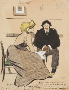 Soffici Ardengo (1879-1964) Dessin de presse au lavis avec rehauts de gouache et crayon de couleur, représentant un couple conversant : « Encore une erreur judiciaire mon ami, il paraTt qu’on aexécuté un pauvre diable voilà dix ans et on...