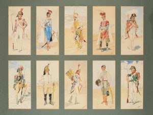 Knotel Richard (1857-1914) Peintre, dessinateur et illustrateur allemand. Ensemble de 10 aquarelles, réunies dans un méme encadrement, représentant des soldats en uniforme du 19e siècle. 24,5 x 11 cm, chaque.