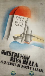 Affiche - Willy Mucha. ‘’Ouistreham-Riva Bella à 3 h. de Paris-St. Lazare’’. Imp. Chachoin, Paris 1934. 99 x 60 cm.