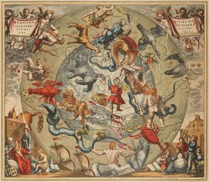 Carte Zodiacale, 1661 Hemispherii Borealis Creli et Terrea Sphsri Sceno-graphia. Auct. Henr. Hondius, Amsterdam, apud Petrum et Gerardum Valter. Planisphère terrestre, orné de figures du zodiaque et de figures animalières symboliques. Coloris...