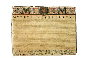 • Vitelleschi (1563-1645) fu generale della Compagnia di Gesù. I trent'anni nei quali ricoprì questo incarico (1615-1645) furono tra i più fiorenti dell'Ordine ; la Compagnia crebbe notevolmente, non solo per membri, ma anche per numero di provincie e missioni. Questo documento venne firmato l'anno successivo alla sua nomina. Rarissimi sul mercato gli autografi di questo celebre personaggio.