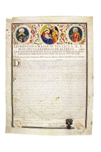 Manoscritto a inchiostro marrone scuro e oro (mm 450x610). Testo in latino inserito in cornice dorata. Timbri in carta parzialmente conservati. Bordo superiore miniato e decorato a motivi floreali.